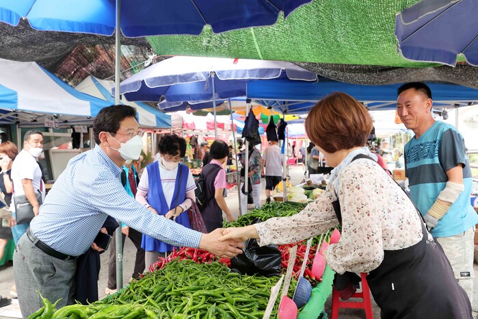 ▲이상일 시장이 용인중앙시장을 찾아 상인들과 인사하고 있다. 용인시 제공 |