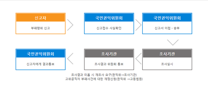 접수된 신고는 사실 확인을 거쳐 감사원·대검찰청·경찰청에 감사‧수사를 의뢰한다. 경우에 따라서는 해당부처에 송부해 점검하는 등 관계부처와 함께 신고처리를 진행된다.