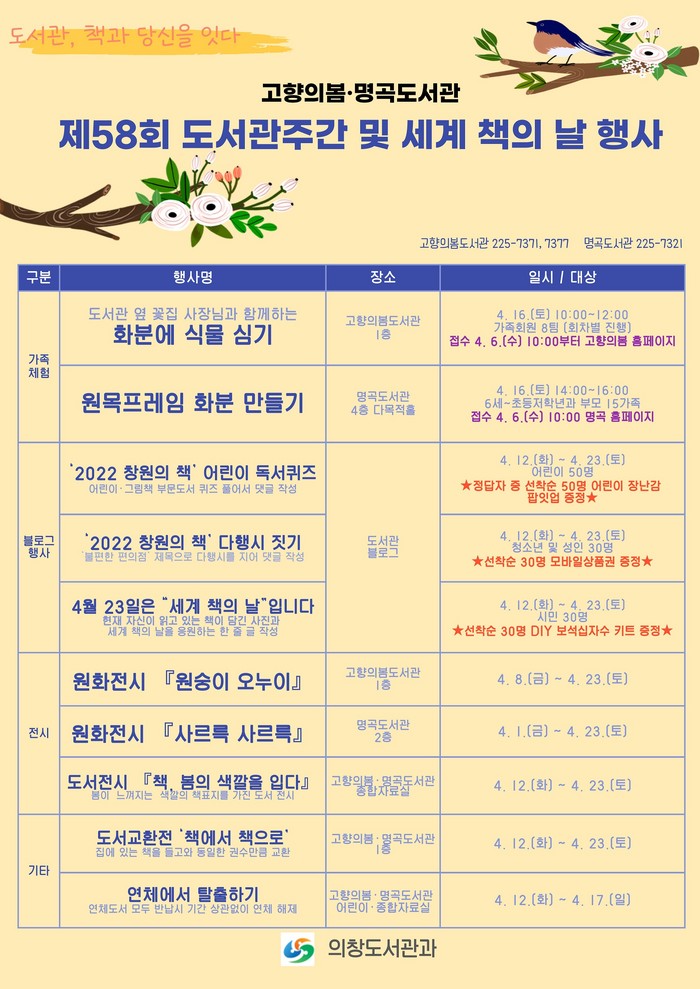 주요 행사로는 △가족체험 ‘화분에 식물 심기(고향의봄)’, ‘원목프레임 화분 만들기(명곡)’, △블로그 행사 ‘‘2022 창원의 책’ 어린이 독서퀴즈’, ‘‘2022 창원의 책’ 다행시 짓기’, ‘4월 23일은 “세계 책의 날”입니다’, △도서전시 ‘책, 봄의 색깔을 입다’, △도서교환전 ‘책에서 책으로’, △연체에서 탈출하기 등 9개의 프로그램이 진행될 예정이다.