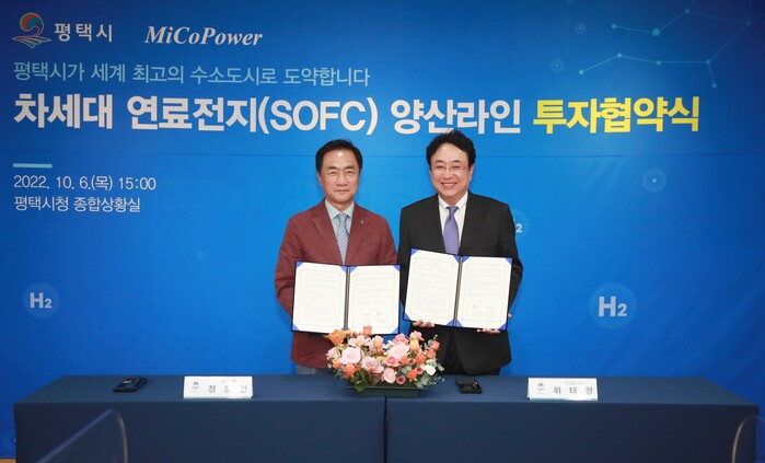 [로컬세계=김병민 기자]경기 평택시(시장 정장선)는 6일 ㈜미코파워와 수소산업의 핵심인 차세대 수소연료전지(SOFC) 양산라인 투자협약을 체결했다고 밝혔다.