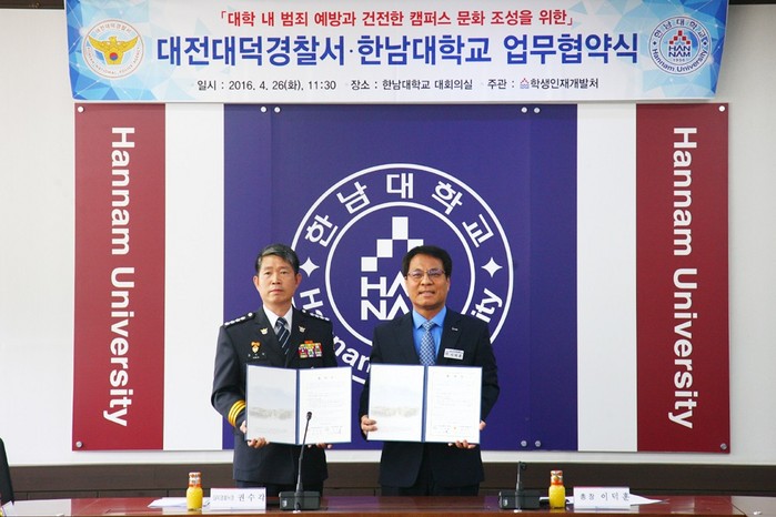[로컬세계 조윤찬 기자]한남대학교와 대전대덕경찰서는 26일 대학 본관 대회의실에서 학생들이 건전한 대학생활을 할 수 있도록 안전하고 평온한 캠퍼스 문화 조성을 위한 업무협약을 맺었다.