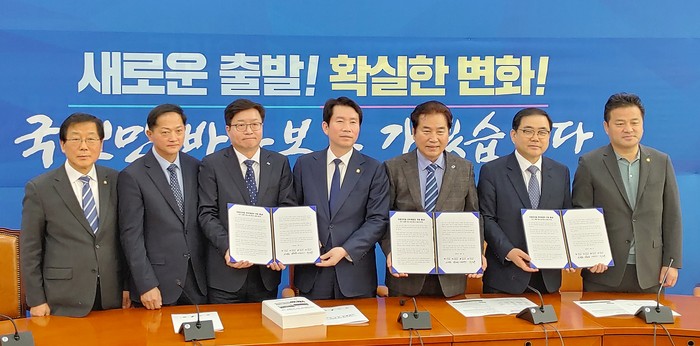 ▲염태영 수원시장(왼쪽 세 번째) 등 100만 대도시 시장들이 이인영 더불어민주당 원내대표(왼쪽 네 번째) 등 지도부를 만나 건의문을 전달했다.(수원시 제공) |