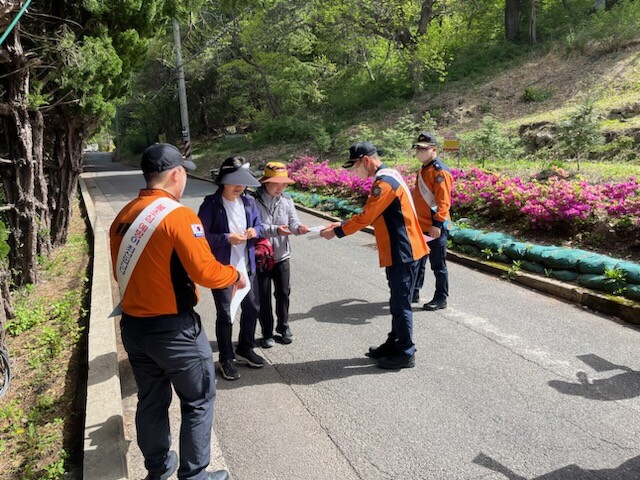 산악 안전지킴이는 산행 중 안전사고가 발생 시 응급처치 등 신속한 대응을 위해 마련된 것으로, ▲등산로 유동순찰 및 안전산행 지도 ▲긴급구조 위치표지판 확인 및 점검 ▲등산로 안전시설 및 간이 구조·구급함 점검 ▲산불예방 홍보 ▲화재예방 홍보물 배부 등 등산객의 안전을 위한 활동을 수행했다.