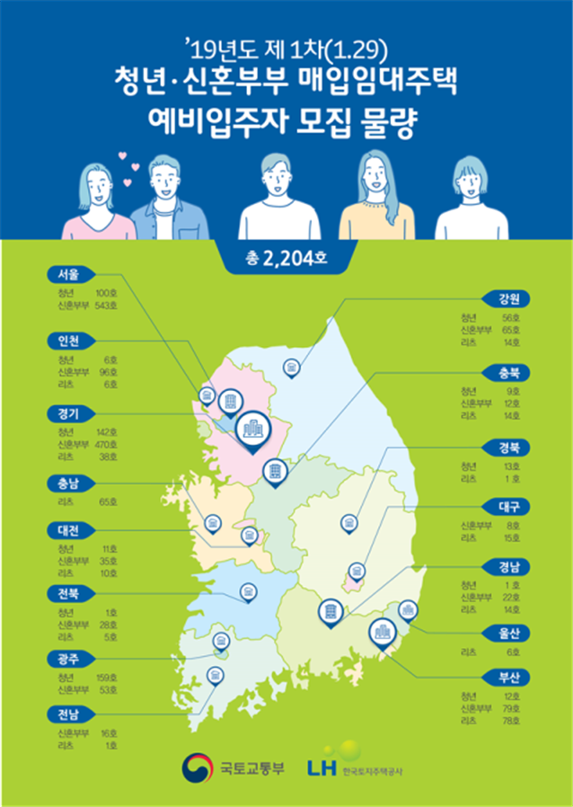국토교통부는 오는 29일부터 전국 83개 지역에서 청년·신혼부부를 위한 매입임대주택 2204가구, 신혼부부를 위한 전세임대주택 5700가구의 입주자를 모집한다고 23일 밝혔다.