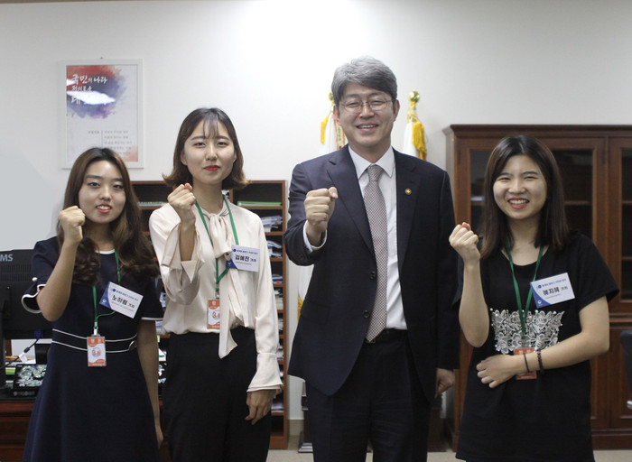 ▲강신욱 통계청장과 통계청 대학생 블로그 기자단이 함께 파이팅을 외치고 있다. |