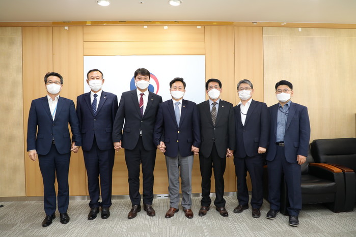 ▲왼쪽부터 이용일 행정안전부 선거의회자치법규 과장, 이치우 창원시의회 의장, 조석환 수원시의회 의장, 고규창 행정안전부 차관, 김기준 용인시의회 의장, 임상규 행정안전부 자치분권정책관, 김군호 행정안전부 자치분권제도 과장 |