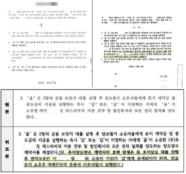 ▲조합을 속이기 위한 서류. 왼쪽이 원본이고 오른쪽이 위조본 |
