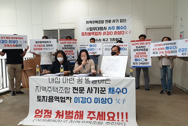조합추진위는 지난달 30일, 주택홍보관에서 기자회견을 열고 “지역주택조합 전문 사기꾼 A씨 및 토지매입용역업자 B씨 부자를 엄중 처벌하고, 이들에 대한 신속하고 철저한 수사를 요구한다”고 소리 높였다.