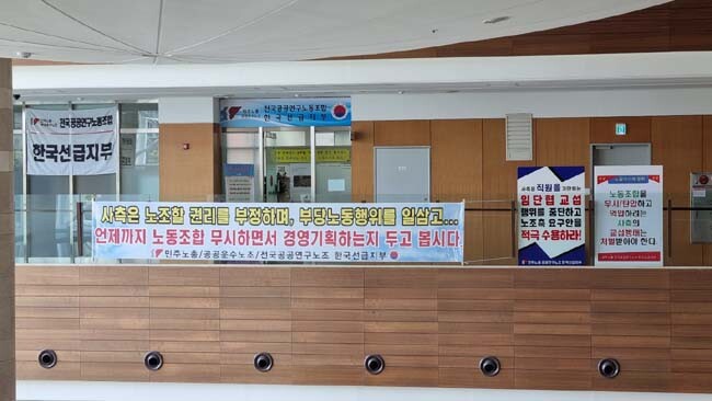 | ▲ 한국선급 노조 사무실 앞에 사측을 규탄하는 현수막과 피켓이 게첩된 모습(사진제공=KR 노동조합) |