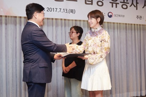 ▲배우 김정은이 입양문화 정착에 대한 공로를 인정받아 2017 입양유공자 시상식에서 대통령 표창을 받았다. 정진엽 보건복지부장관이 배우 김정은에게 대통령 표창장을 전달하고 있다. (사진제공=대한사회복지회) |