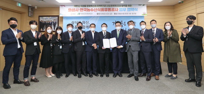 [로컬세계 고용주 기자]경기 화성시가 한국농수산식품유통공사(aT)와 저탄소 식생활 문화 확산 및 지역 먹거리 선순환체계 조성을 위한 업무협약을 체결했다.