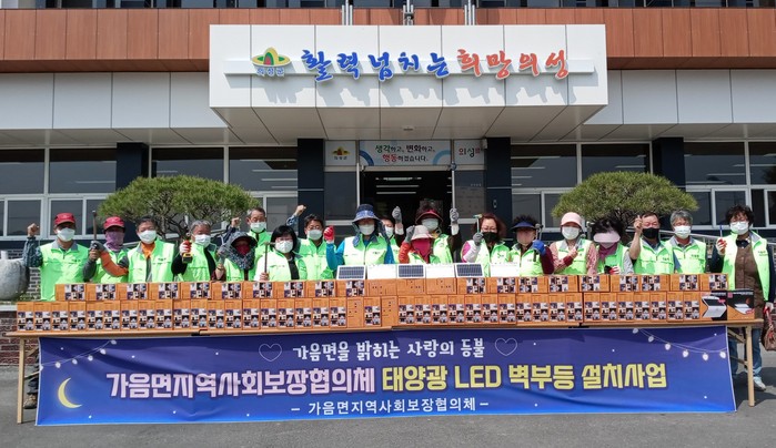 태양광 LED 벽부등 설치 사업은 행복한 가음면을 만들기 위한 가음면지역사회보장협의체 특화사업의 일환으로, 어둡고 후미져 어르신들의 보행이 어려운 골목길 65곳을 선정해 협의체 위원들이 직접 태양광 LED 벽부등을 설치하는 사업이다.
