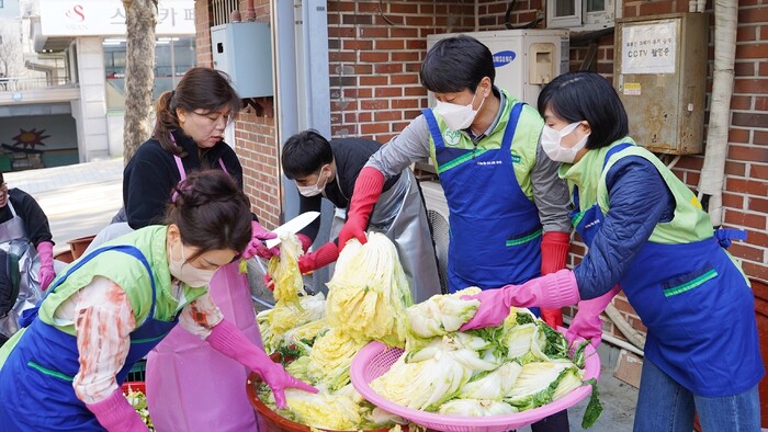 ▲ 23일(수) 김장철을 맞이하여 농협유통 임직원들이 서울시 서초구에 위치한 새빛맹인선교회에 방문하여 김장하는데 필요한 일손을 보태고 있다. |