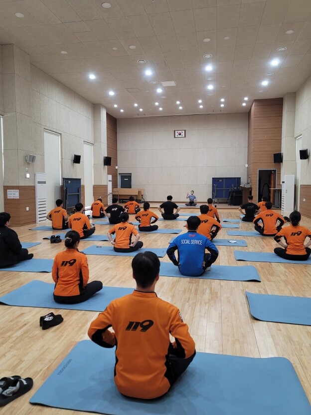 ▲부산 중부소방서는 18일 본서 강당에서 현장대원들을 대상 몸과 마음 맞춤형 운동 프로그램을 운영했다. <중부소방서 제공> |
