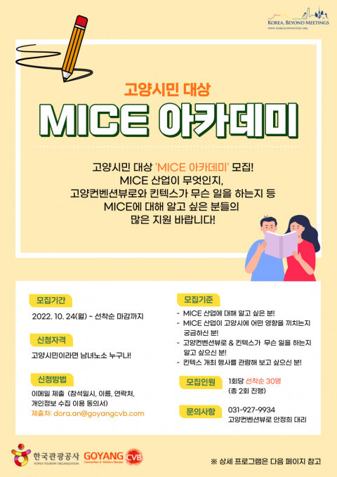 [로컬세계 = 이영원 기자]경기 고양시가 주최하고, 고양컨벤션뷰로가 주관하며, 한국관광공사가 후원하는 ‘고양시민 MICE 아카데미’가 11월 3일, 23일 총 2회에 걸쳐 진행될 예정이다.