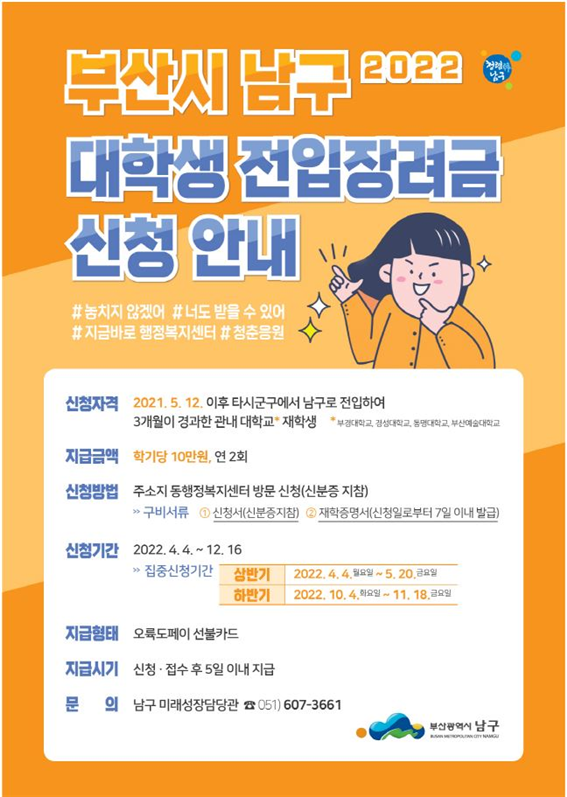 ‘남구 대학생 전입장려금 지원사업’은 2021년 5월 12일이후 타 시군구에서 남구로 전입해 3개월이 경과한 남구 소재 대학교(부경대, 경성대, 동명대, 부산예술대) 재학생을 대상으로 한다.