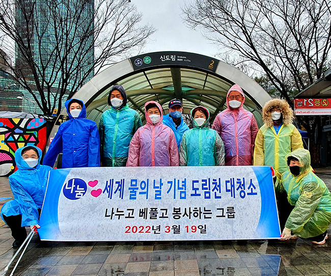 ▲ 나누고 베풀고 봉사하는 그룹은 ‘2022세계 물의 날(22일)을 기념해 서울시 구로구 도림천과 신도림역 주변에서 생활하천 정화활동을 펼쳤다./사진=나베봉그룹 |