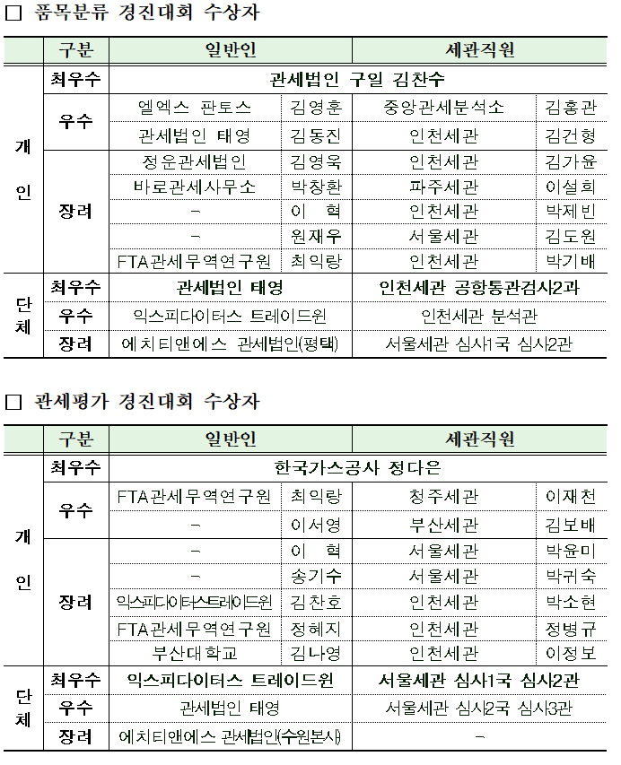 관세청 관세평가분류원은 2일 지난달 24일과 26일에 시행된 제23회 품목분류 경진대회와 제20회 관세평가 경진대회 개최 결과를 발표했다.