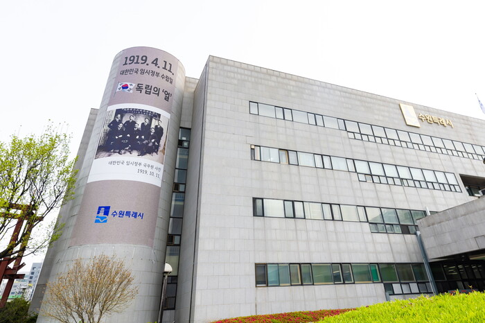 [로컬세계=김병민 기자]경기 수원시가 제105주년 대한민국 임시정부 수립을 기념해 시청 본과 외벽에 대한민국 임시정부 국무원 요인들의 사진을 인쇄한 대형 현수막을 게시했다.