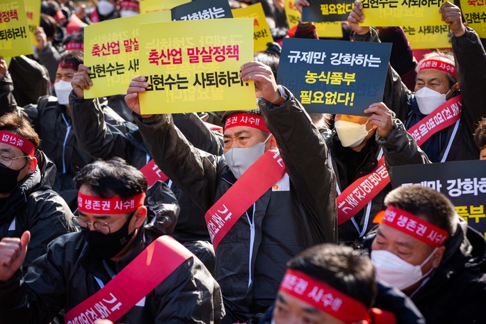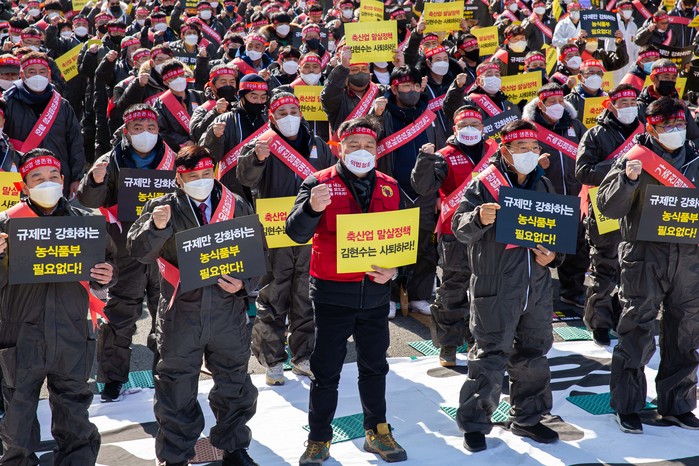 이날 전국에서 모인 대한한돈협회를 비롯한 축산관련단체협의회 소속 299여명의 축산농가들은 축산농민의 생존권을 위한 △김현수 농림축산식품부 장관 퇴진, △축산농가 다 죽이는 가전법 개정 즉각 철회, △한돈농가 8대 방역시설 의무화 철회, △농가 죽이는 방역규제 철폐하고 상생대책 제시 등 4대 요구사항을 천명했다.