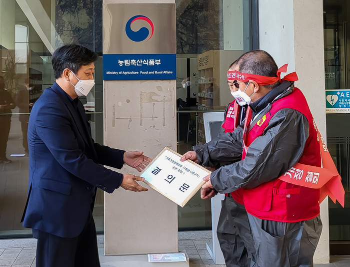 ▲축산관련단체협의회 관계자들이 농식품부 이동식 방역국 방역정책과장에게 가축전염병예방법 즉각 철회 결의문을 전달하고 있다. |