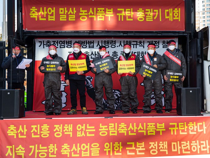 농식품부가 지난 12일 방역 규제 위반시 사육제한·폐쇄 명령이 가능하고, 전국 한돈농가에 8대 방역시설을 의무화하는 내용의 가전법 시행령·시행규칙 개정(안)을 입법예고한 가운데 이를 규탄하는 전국 축산농민들의 목소리가 결국 이날 활화산처럼 터졌다.