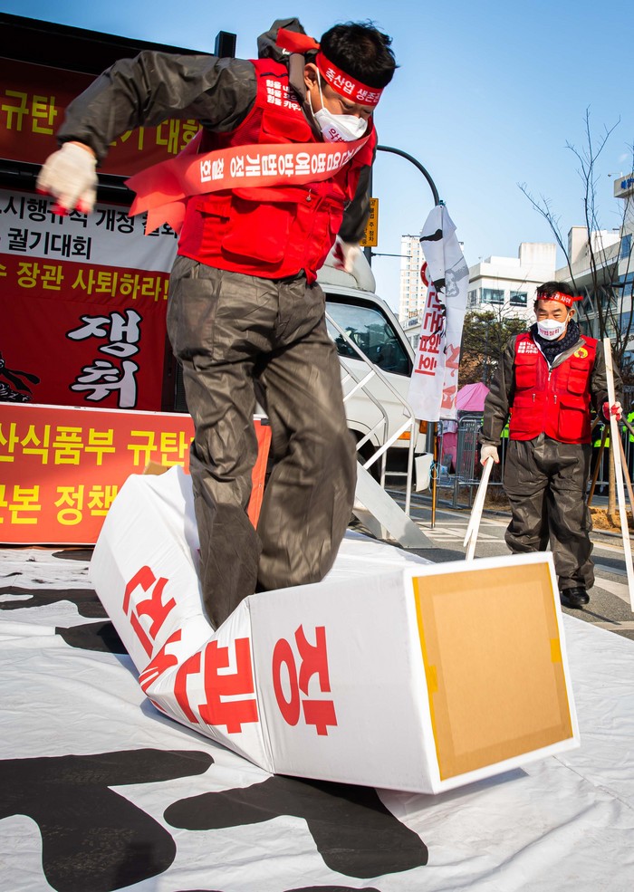 또한 집회 참가자들은 축산농가를 우롱하는 김현수 장관에게 항의의 의미를 담아 가전법 개정 즉각 철회가 새겨진 조형물을 격파하는 퍼포먼스를 강행하기도 했다.