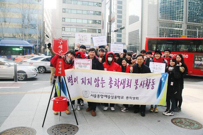 ▲서울종합예술실용학교 학생들이 구세군 자선냄비운동본부에 100만원을 전달한 뒤 기념촬영을 하고 있다. |