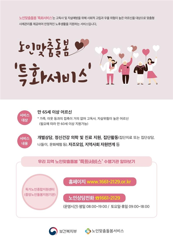 특히 노인맞춤돌봄서비스 대상 중 사회관계가 취약하거나 우울감이 높은 어르신은 특화서비스에 따라 자살예방, 우울증 경감을 위해 개인별 상담 및 사례관리를 통한 정서지원 프로그램을 제공한다.