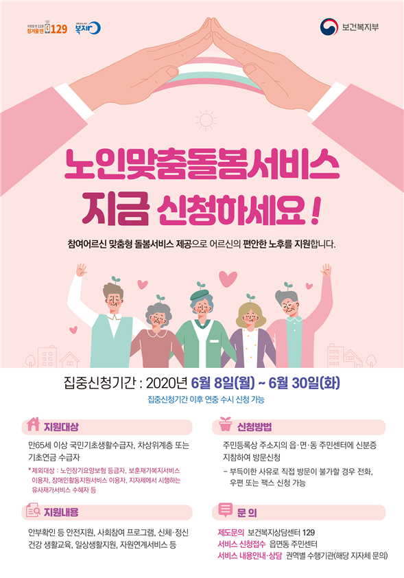 보건복지부는 8일부터 30일까지 노인맞춤돌봄서비스 집중 신청기간을 운영한다고 밝혔다.