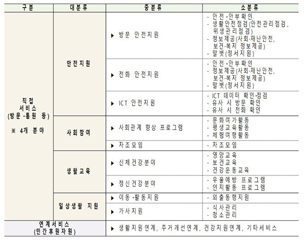 이렇게 대상자로 선정되면 안전지원, 사회참여, 생활교육, 일상생활 분야의 다양한 서비스를 서비스 제공계획에 따라 직접 또는 연계하여 제공받을 수 있다.