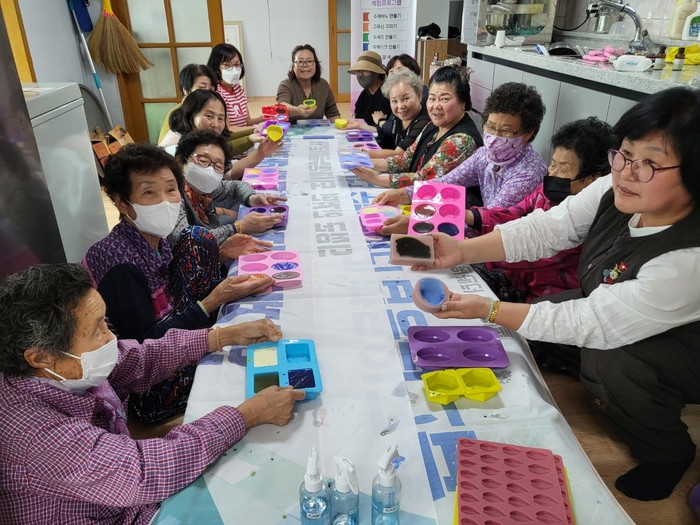 현리2리 부녀회와 마을어르신들이 경로당에 옹기종기 모여 이야기꽃이 피어나고 손이 어둔한 어르신들의 비누만들기를 서로 도와주며 주민들의 관계가 더욱 친밀해지는 자리가 됐다.