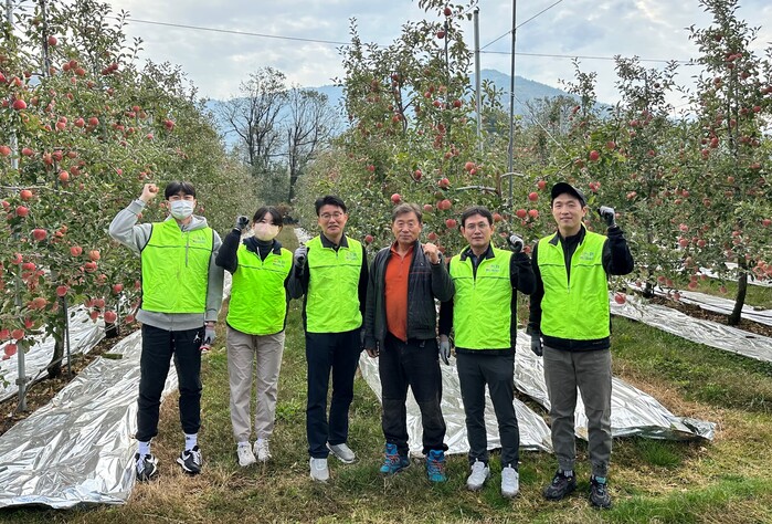 ▲ 농협경제지주 축산컨설팅부는 21일 충북 괴산 소재의 사과농가를 방문해 수확작업에 동참하며 구슬땀을 흘렸다. |