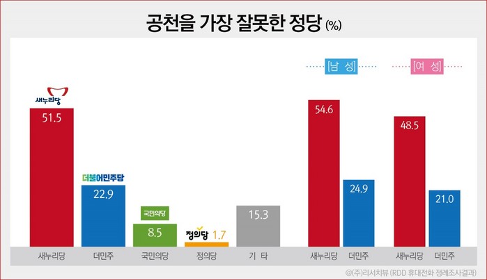 여론조사전문기관 <리서치뷰>가 후보등록 마지막 날인 3월 25일 정기조사를 실시한 결과 제20대 총선 관련 공천을 가장 잘못한 정당으로 과반이 넘는 51.5%가 새누리당을 꼽았으며 더민주당(22.9%), 국민의당 (8.5%)이 뒤를 이었다.
