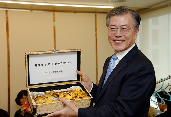 ▲문재인 대표가 1월 27일 중앙당 당직자들과 오찬에서 디지털미디어국 당직자들이 깜작 선물로 “금괴는 댁에 많으실테니 금화를 퇴직금으로 드리겠다”면서 받은 금화 모양의 초콜릿들을 보여주고 있다. |