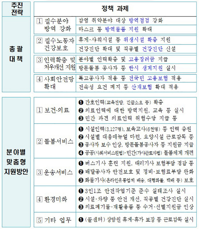 이번 대책과 관련해 이 장관은 “필수노동자들은 그 중요성에도 불구하고 상시적 감염위험, 장시간 근로, 낮은 처우 등 복합적인 어려움에 처해있다”고 지적했다.