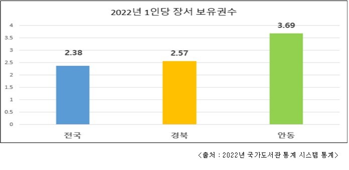 또한 2022년도 국가도서관 통계에 따르면 작은도서관을 제외한 안동의 공공도서관 장서 수를 1인당 보유 권수로 환산하면 3.69권으로 경북이나 전국 통계보다 훨씬 높은 수준이다.