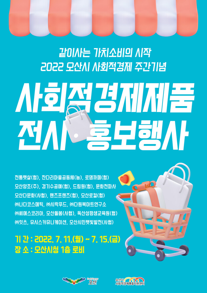홍보‧전시 행사에는 관내 19개 사회적 경제 기업이 참여하여 수공예제품부터 안전한 먹거리까지 다양한 제품을 전시‧홍보하며, 오산시에서는 사회적경제 대시민 홍보와 사회적 경제 기업의 판로지원을 위해 오산함께장터를 운영 중으로 다양한 제품 및 서비스를 만나볼 수 있다.
