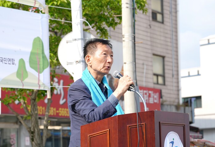 ▲ 피스로드 2024 통일대장정 평화걷기대회에서 격려사하는 박상선 공동위원장 |