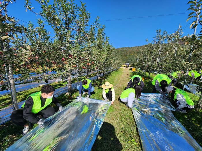 ▲ 농협 상호금융리스크관리부와 상호금융소비자보호부 임직원들은 18일 경북 문경시에서 사과 수확 등 농가 일손돕기에 나섰다. |