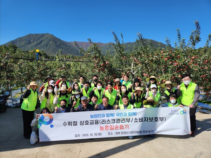 같은 날 임도곤 상호금융리스크관리부장과 김동석 상호금융소비자보호부장 등 2개 부서 직원 30여명은 경북 문경시에 위치한 과수 농가를 방문해 한마음 한뜻으로 사과를 따고 수확한 사과를 공동구매하며 일손돕기의 의미를 더했다.