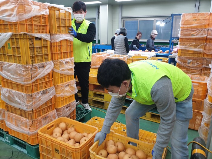▲ 농협경제지주 공판사업분사 임직원들이 배 성출하기를 맞아 19일 충남 아산시 음봉농협 농산물산지유통센터(APC)를 방문해 배 선별작업을 하고 있다. |