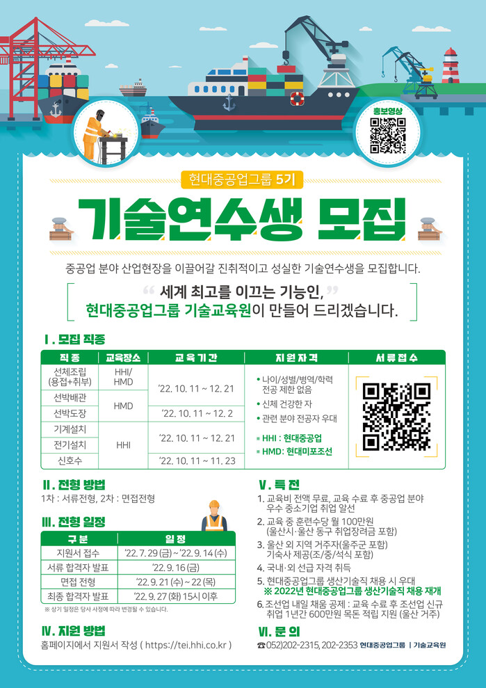 기술연수생 지원 희망자는 9월 14일까지 현대중공업 기술교육원 홈페이지에서 온라인 접수하면 된다.