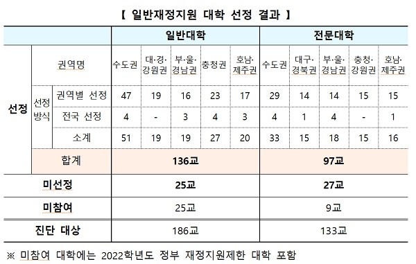 대학구조개혁위원회의 최종 결정에 따라, 2021년 진단에서 일반재정지원 대학으로 선정된 대학은 일반대학 136개교, 전문대학 97개교 등 모두 233개교(진단 대상 대학의 73%)다.