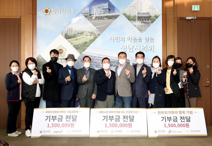전달식에는 성남시의회 윤창근 의장, 더불어민주당 마선식대표의원, 국민의힘 이상호 대표의원과 관내 사회봉사단체인 '우리한부모 가족지원센터' 이지우 대표, '소망재활원' 김병준 원장, '사랑마루' 변현석 대표와 성남이로운재단 최병주 이사장이 참석했다.