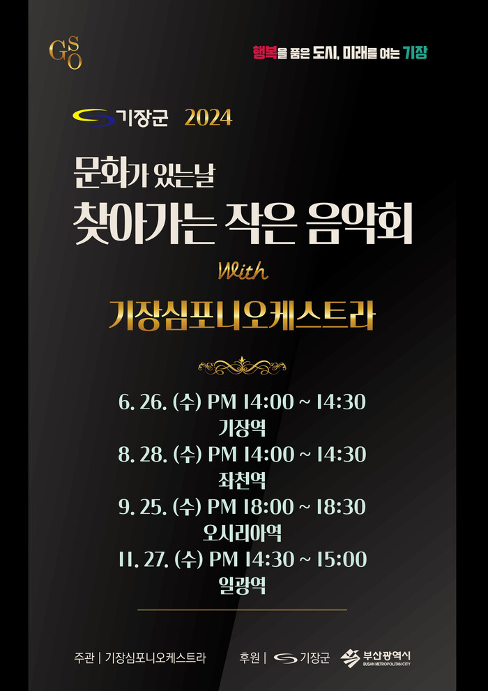 ‘찾아가는 작은 음악회’는 주민들에게 생활속에서 문화예술을 향유하는 기회를 제공하기 위해 마련됐다. ‘부산광역시 2024 구‧군 문화가 있는 날’ 지원사업 공모 선정으로 추진됐으며, 동해선 역사와 협의를 거쳐 기장심포니오케스트라의 연주로 진행된다.
