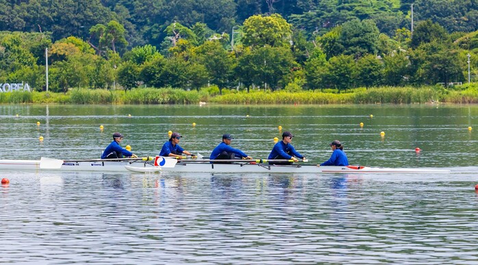 ▲2022충주탄금호전국장애인조정대회 PR3 1000m 단체전에 참가한 (좌측부터) 강현주 선수, 배지인 선수, 최범서 선수, 강이성 선수, 조연희 감독 |