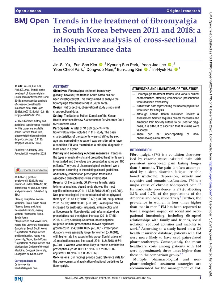 ▲‘BMJ Open (IF=2.9)’에 게재된 해당 논문 「Trends in the treatment of fibromyalgia in South Korea between 2011 and 2018 : a retrospective analysis of cross-sectional health insurance data」 |