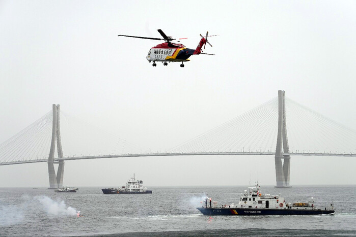 [로컬세계 부산=맹화찬 기자]남해지방해양경찰청은 17일 오후 2시 부산시 가덕도 주변 거가대교 앞 해상에서 민‧관‧군이 유기적으로 어우러져 수난대비 기본훈련을 펼쳤다고 이날 밝혔다.