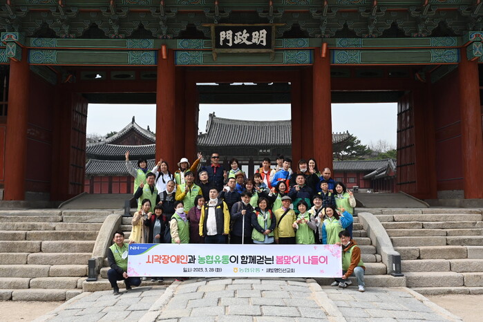 ▲ 28일 농협유통 임직원들이, 새빛맹인선교회 시각장애인들과 창경궁에서 봄나들이를 하고 있다. 농협유통 제공 |